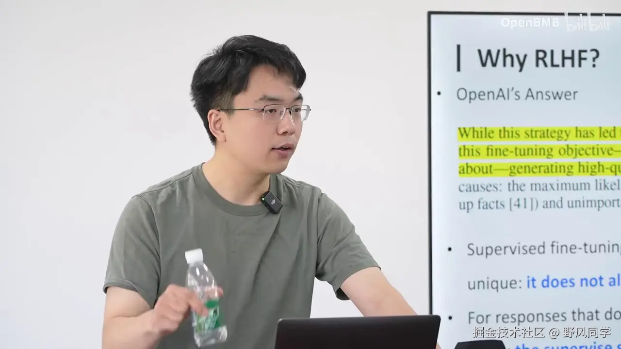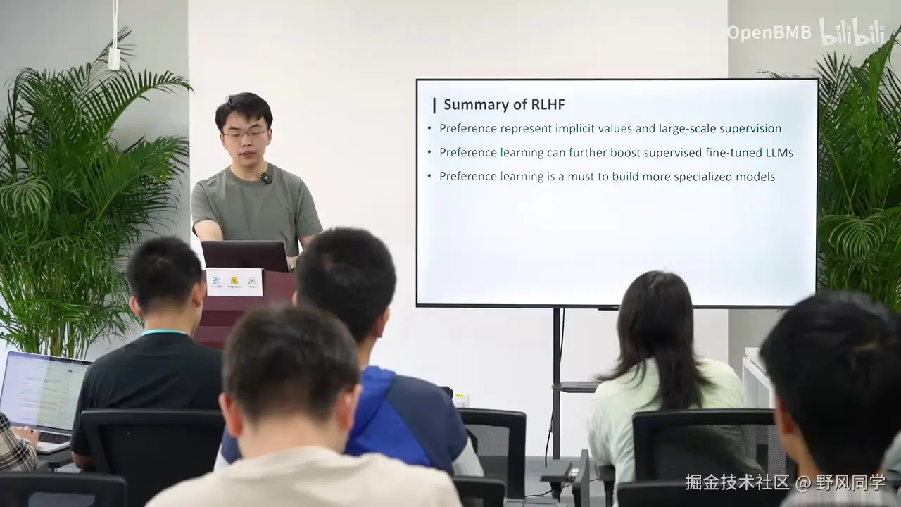 接下来我们将进行一个总结。RLHF,或者说称为Preference Learning,即偏好学习,它为大模型提供了一种超越答案的更为微妙的监督信号。它实际上是在告诉大模型A优于B。我们采用类似之前的思路进行扩展。当我们知道A优于B时,通过不断扩展,我们可能能够理解模型,进而理解整个世界,整个宇宙的信息。当我了解到宇宙中什么是更好的,我就隐含地学到了人类的价值观是什么样的,人类希望我具备什么样的能力,人类希望我的数学水平达到什么样,这些都隐含地被学习到。因此,无论是RLHF、PPO、DPO还是其他各种Po,其本质最重要的是偏好本身。很多时候,你甚至不需要Po,可能只需要SFT,通过不同的方式进行SFT也能学习到这种偏好。今天的课程到这里就结束了,我们讲了预训练,模型在大规模无监督语料上进行预训练,然后是后训练,在有监督的数据上进行学习。后面其实还有一个superalignment,这里我做了PPT,但后面会有一节课专门来讲这个内容。简单来说就是。