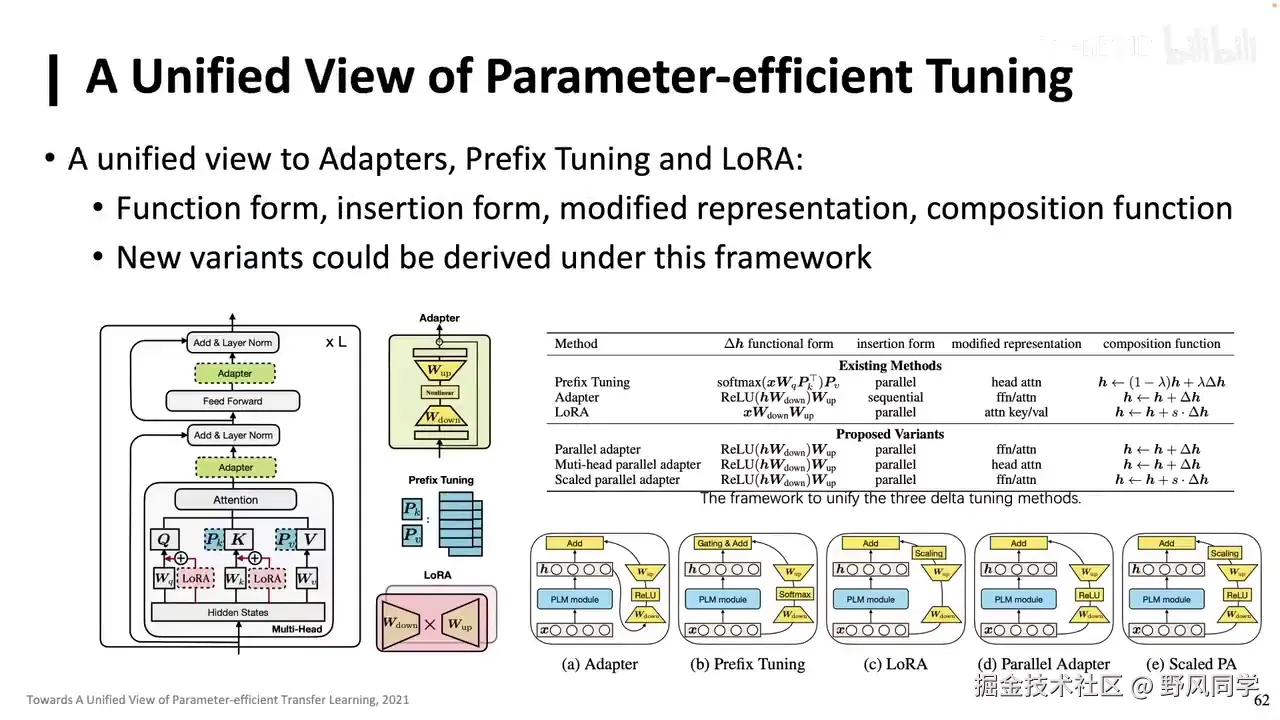 - Adapter、Prefix Tuning和LoRA。