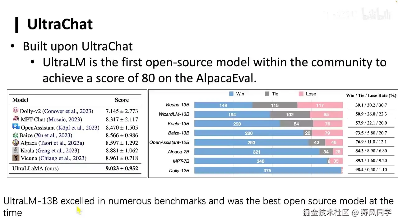 - UltraChat是首个在斯坦福AlpacaEval上超过80分的开源模型。