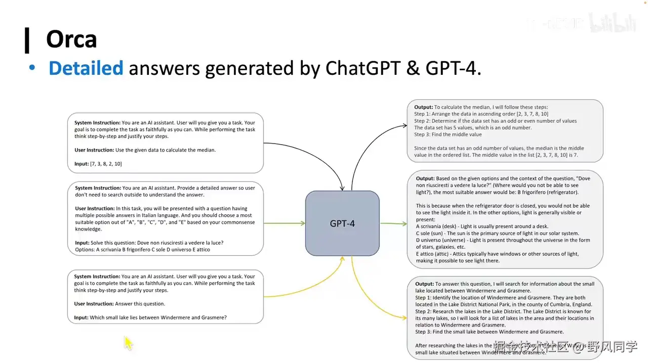 它是第一个在斯坦福的AlpacaEval上超过80分的开源模型。当然现在几乎大家都能超过80分了,甚至都能超过90分了。然后当时它的效果应该也是开源中最好的。这就是我们做的UltraChat。我们可以看到UltraChat的思想是,我不要任务的概念。我啥都转化成信息流,或者说信息人和机器对话的本身。这是一个极端。我们还可以做另一个极端,就是我们把任务的概念发挥到极致。比如说有个刚才之前提到的任务叫Flan。我们可以把Flan里面可能有几千个任务。我们把里面所有的任务,每一个任务都拿出来,把Prompt拿出来。用GPT-4给它做回答,然后生成一波这种数据。所以说这两个其实大家想想非常有意思。UltraChat和Orca两个极端,但是好像在做同一件事情。不管我是一开始就模糊任务,还是我把任务做到极致,其实也是在一种,其实也就没有了任务。你就把任务本身给模糊化了。然后它就把所有的这种输入出来,拿出来用GPT-4做。