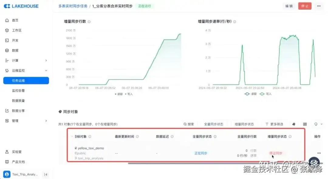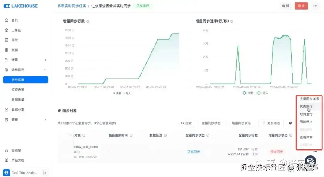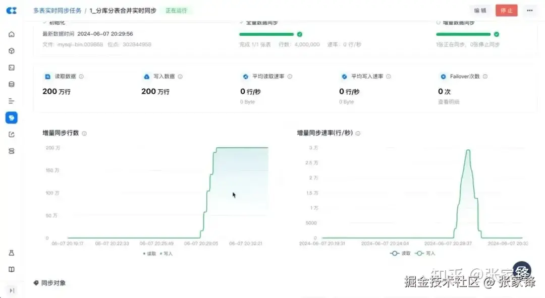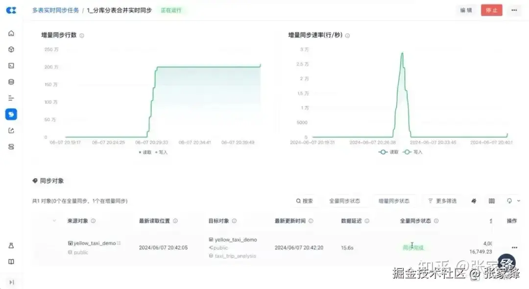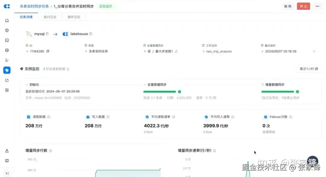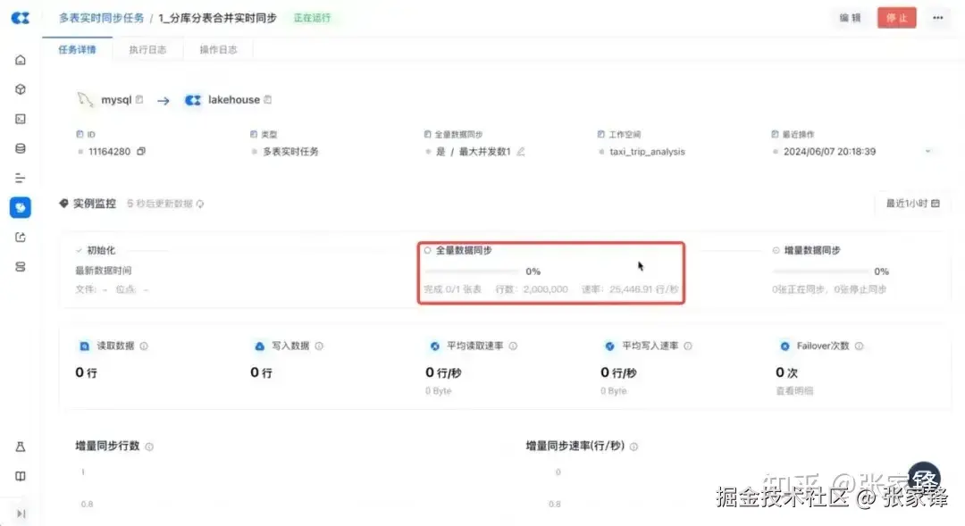 在运维界面中,可以看到任务正在全量同步阶段,数据已经写入 200 万行,速率在 25, 000+ 行/秒。