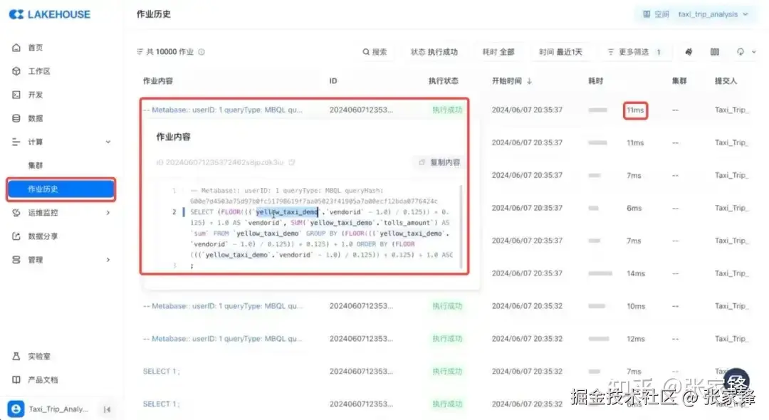 云器产品里提供了作业历史产品模块,可以看到提交给引擎的所有 SQL 明细。从下图中可以看到,实时同步写入的是 yellow_taxi_demo 表,在Metabase BI 看板里实时查询的也是该表。而且在演示的这个相对复杂的查询条件下,进行了400万行数据的全表扫描,能在 10 毫秒左右返回查询结果。云器Lakehouse的方案不需要新增额外的加速引擎来进行查询加速,也省去了再同步复制一份数据,所以能够极大地节约成本。