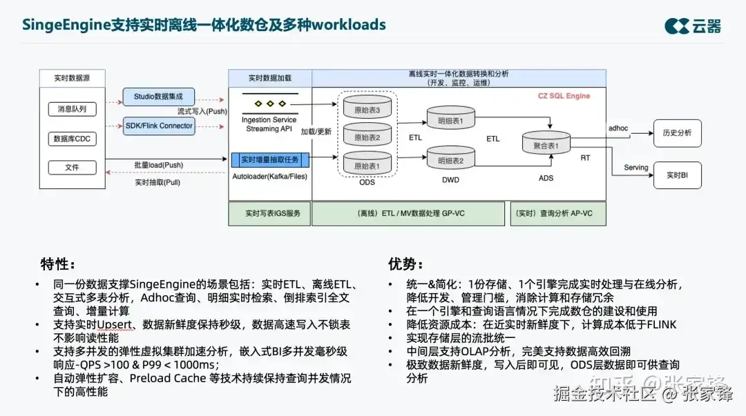 在传统的离线数仓中,数据进来做完 ETL 的各种处理加工后,直接对接 BI 引擎查询会很慢,所以通常会采用一些实时分析引擎,比如 Clickhouse 等,再做查询加速。但在云器的方案中完全不需要,源端表能够被实时写入,也能够被实时查询,以及通过批处理加工后被实时查询分析。
