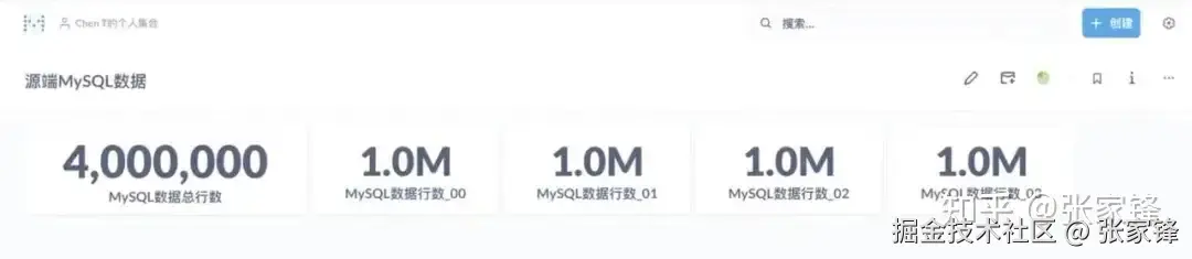 我们可以通过BI报表来检查源端数据库的数据情况,源端总共四张表,各有 100 万行数据,需要把这 400 万行数据同步到目标表里。在前面配置过程中可以看到每张表有20 多个字段,而且字段类型大部分是 String 类型,单条记录的size不算小,是比较贴合真实生产上的业务数据库的情况。