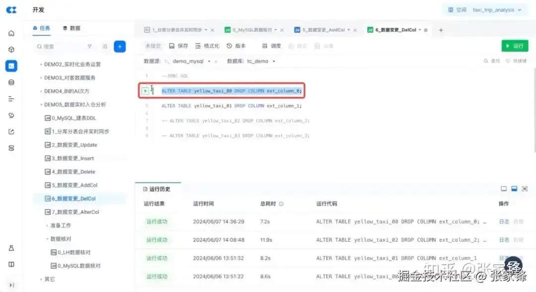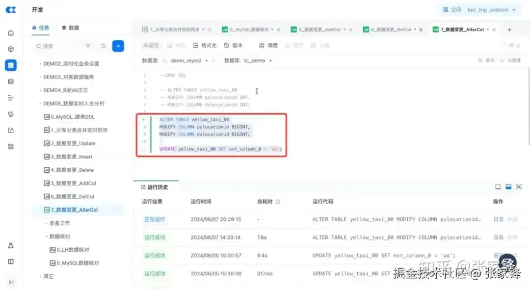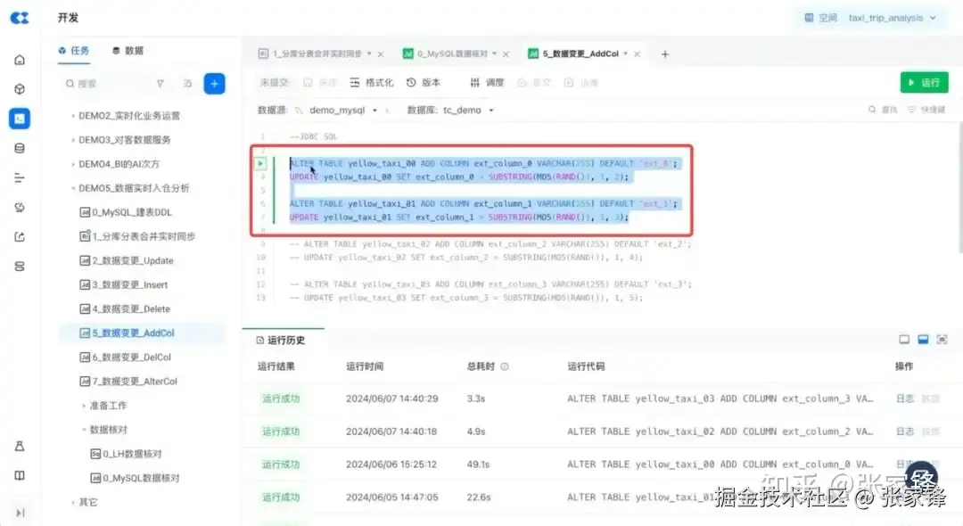 云器Lakehouse产品支持直接操纵源端数据库,通过 SQL 来对源端数据库进行修改、查询等操作,首先我们对源端数据进行变更,先在源端添加一些新的字段:ext_column_0 & ext_column_1,并在源端表里删掉一个字段,同时更改一个字段类型从 int 改为 bigint 。