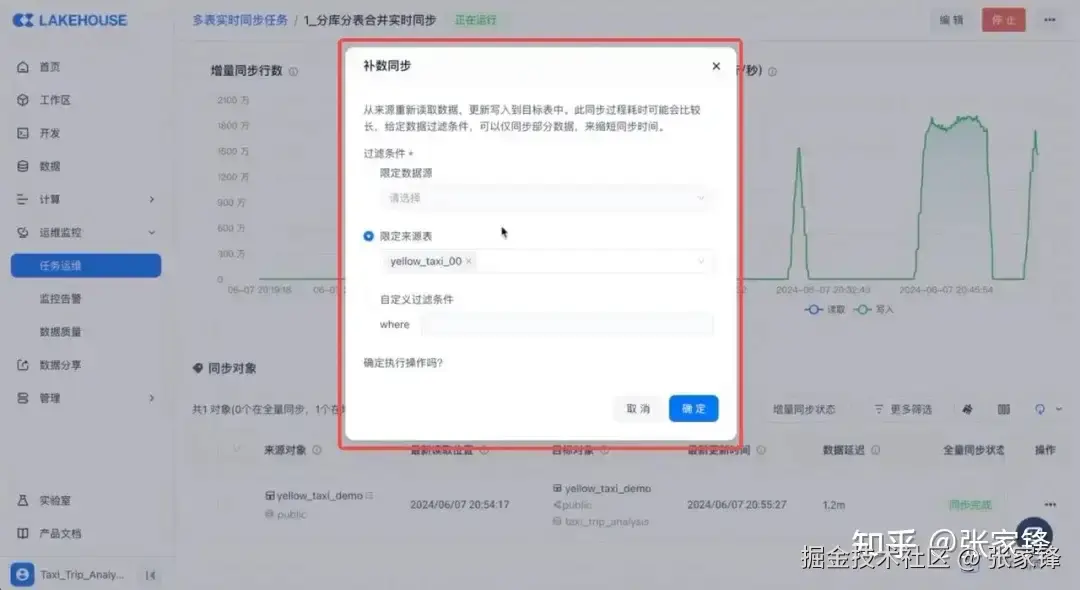 例如在实时同步运行中,源端数据发生了变化,某个表中的数据出现了问题,针对这种情况,我们提供补数同步功能,支持对特定表重新进行全量同步。在业务突发高峰,源端变更流量非常大时,多个表的变更数据的实时同步会相互影响。这两种情况下,都可以通过全量补数同步的功能去加速数据同步过程。以下图为例,对源端表 yellow_taxi_00 表重新进行补数全量同步,其增量实时同步会被暂停,后台会通过全量的方式把源端数据重新同步。补数修订的全量同步完成后,增量同步会自动启动,无需再手动操作。