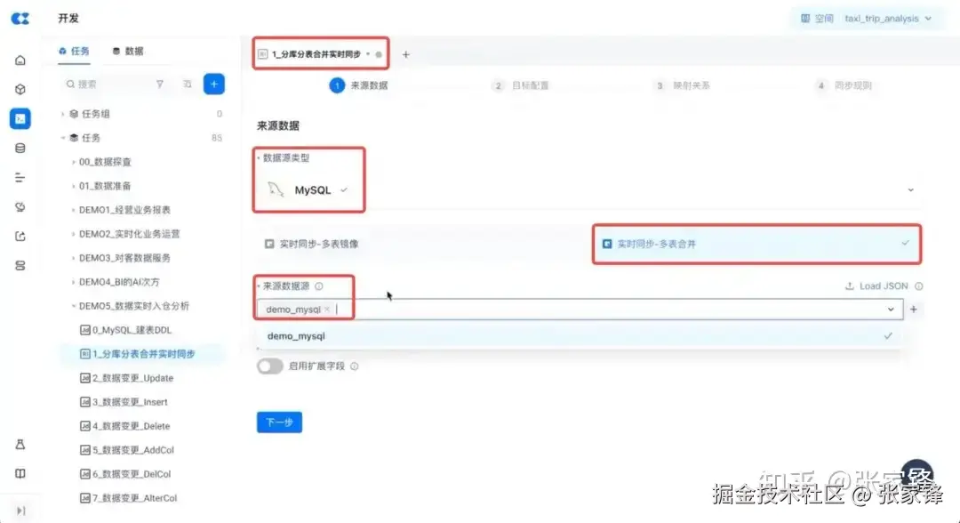 - 第二类是多表合并,也是本次演示所中用到的场景。在源端数据量特别大、有分库分表场景的情况下,同步过程中,需要提前把需要 ETL 处理的 transform 过程完成,多张表合并写入到同一张表中,这样在后续查询中不需要再进行多表join,为查询提速。