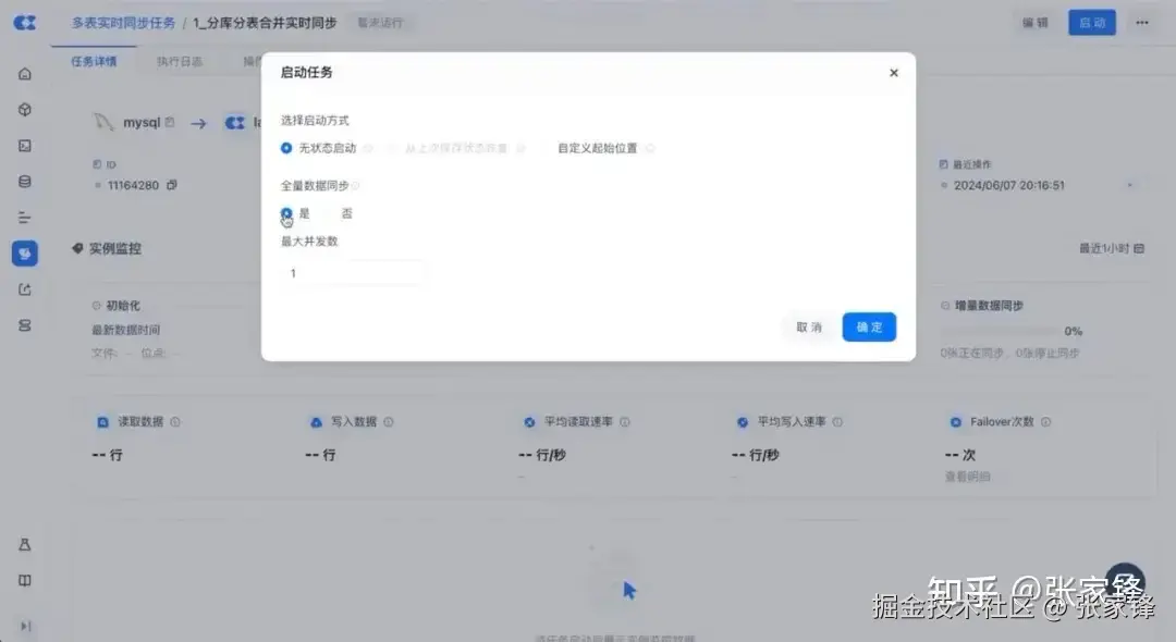 任务启动时,可以根据实际需求,选择是否进行全量数据同步。首次同步的数据,通常建议选择做一次全量数据同步,然后再进行增量数据同步。
