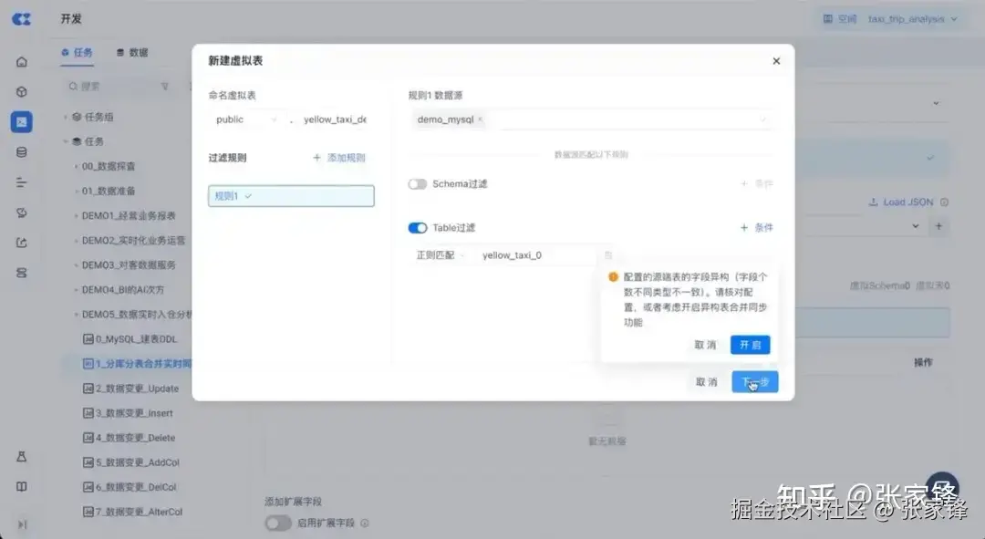 接下来配置需要同步的对象。云器提供了丰富的过滤规则来筛选源端表,比如命名的精确匹配、正则匹配等,可以按需使用。在源端表字段存在不一致的情况下,Lakehouse实时同步会自动检测识别,提示用户开启异构表合并同步功能。异构表合并同步功能作用是在目标端的表中,取源端表字段的并集进行建表,确保源端所有的数据能被同步写入到目标端。