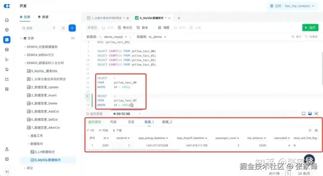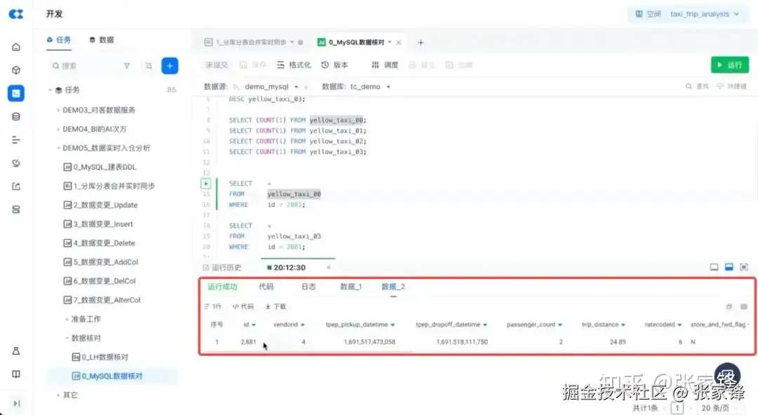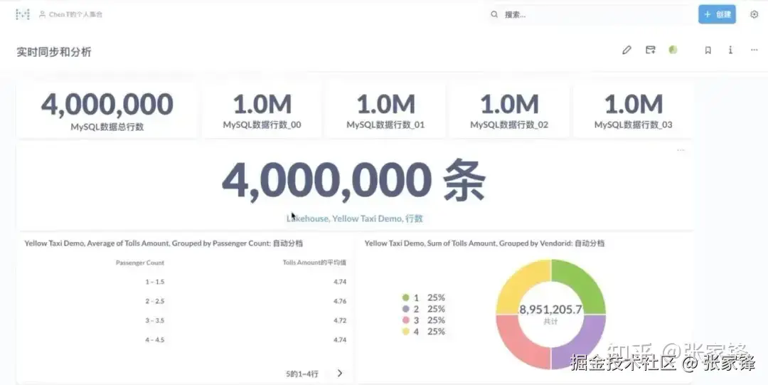 下图为本次DEMO的 BI 报表示意,展示源端 MySQL 数据行数的统计,目标端是云器 Lakehouse 内的数据行数,并做了一个复杂查询分析,按照不同的乘客数量统计费用的平均值。实时同步写入的表,跟查询的表是同一张表。