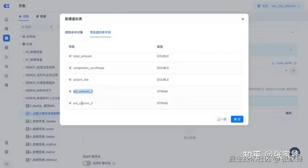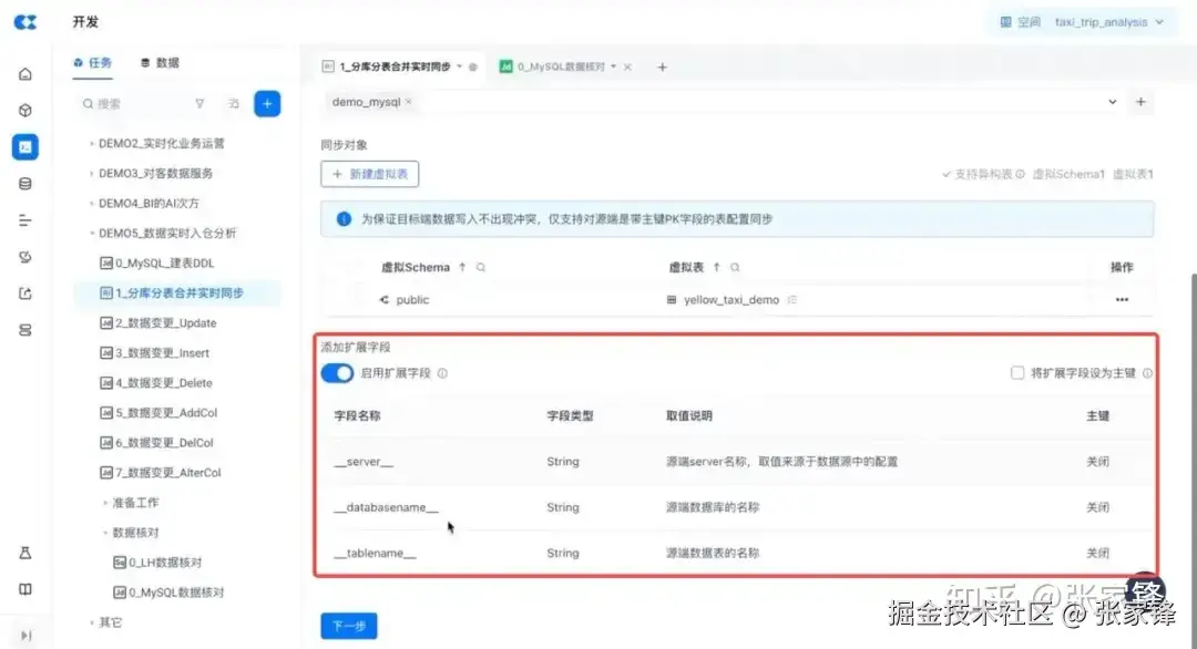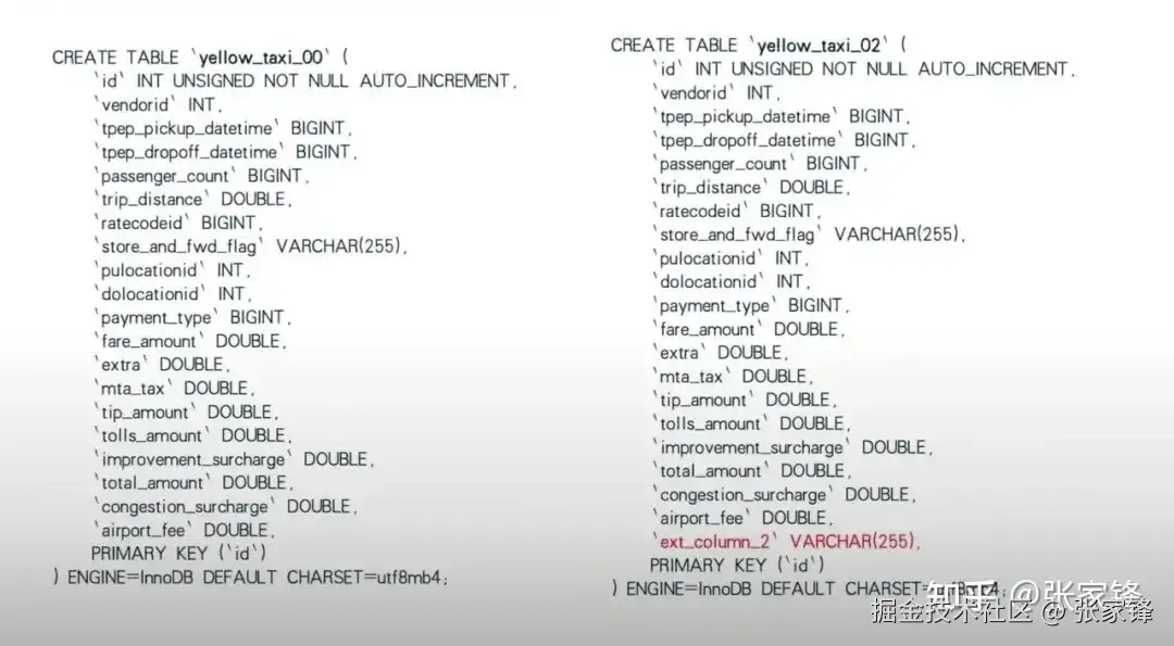 本演示以常见的 SaaS 服务模式为例,多租模式下,其底层业务数据库中,某些租户的信息会存在同一张分表内,分表下包含租户定制的扩展字段,即源端是基本相同的四张分表,但部分表的字段存在细微差异,如下图所示,yellow_taxi_02 表包含扩展字段 2 。