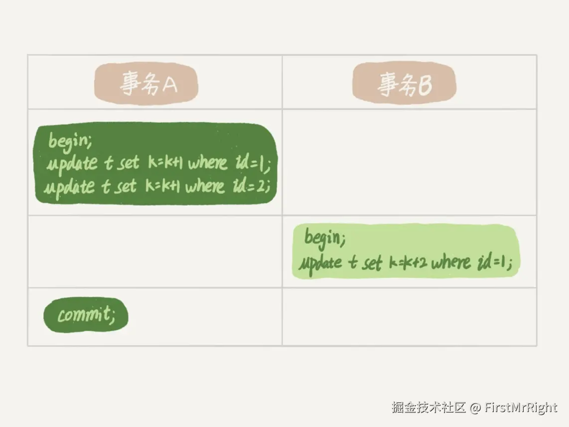 事务A先开始执行,事务B随后开始,两者同时更新id为1的数据行,结合InnoDB存储引擎的行锁机制,由于事务A先开始事务,此时对id为1的行进行加锁,那么即使事务B已经开始,那么依然要等到事务A提交释放行锁后才可开始执行。