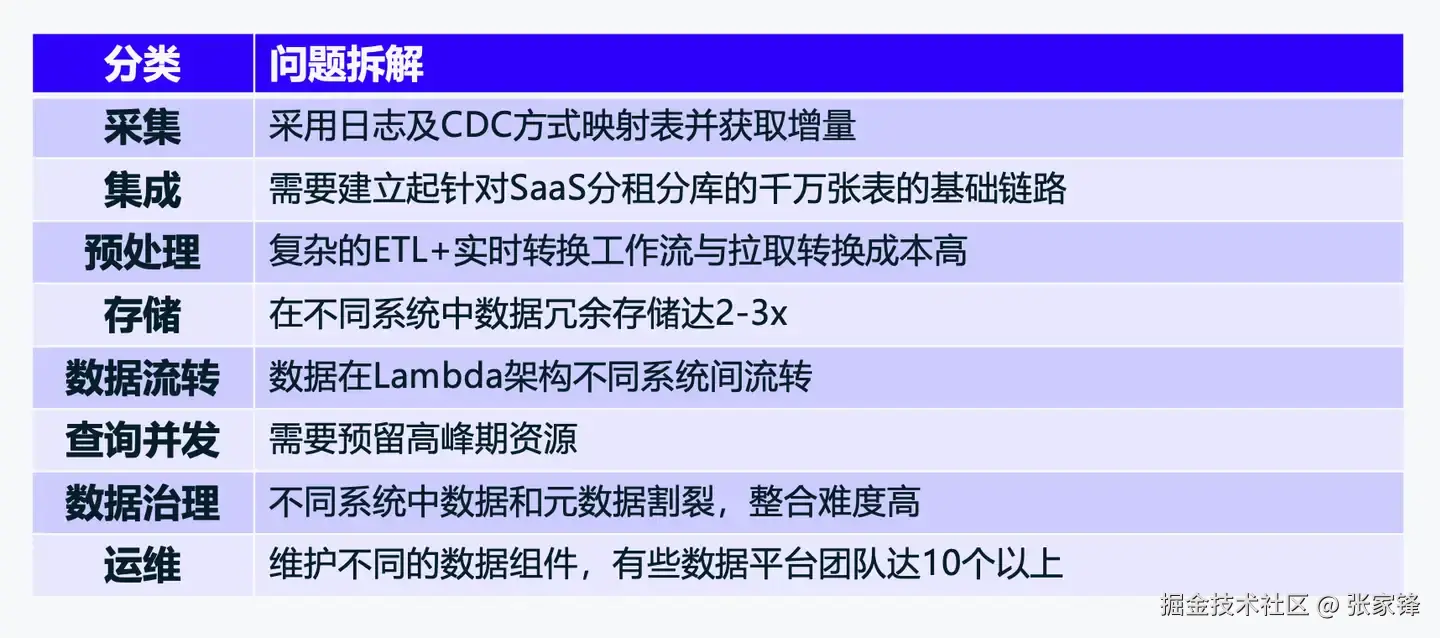 盘点成本问题,我们重新梳理了整个数据链路,从采集到最后运维的整条链路,总结了原架构造成高成本的原因(见下表),可见企业的数据链路成本问题不仅仅是计算成本,运维成本,架构和数据各个链条上,都有成本问题需要考虑。我们认识到,用全开源方案在单个点上或许可以达到成本的优化,而从整体链路来看,成本问题要系统性统一的解决才更合理。