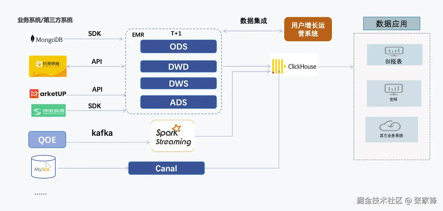 分秒帧技术部门需要支撑内部业务系统、市场、运营、销售、客户成功等多个部门的BI报表分析,早期采用Spark做离线表报,随后逐步增加了Spark streaming、Kafka、Clickhouse等开源大数据组件,以满足OLAP分析以及实时BI看板场景,最终形成基于Lambda架构搭建的数据平台。升级前架构如下: