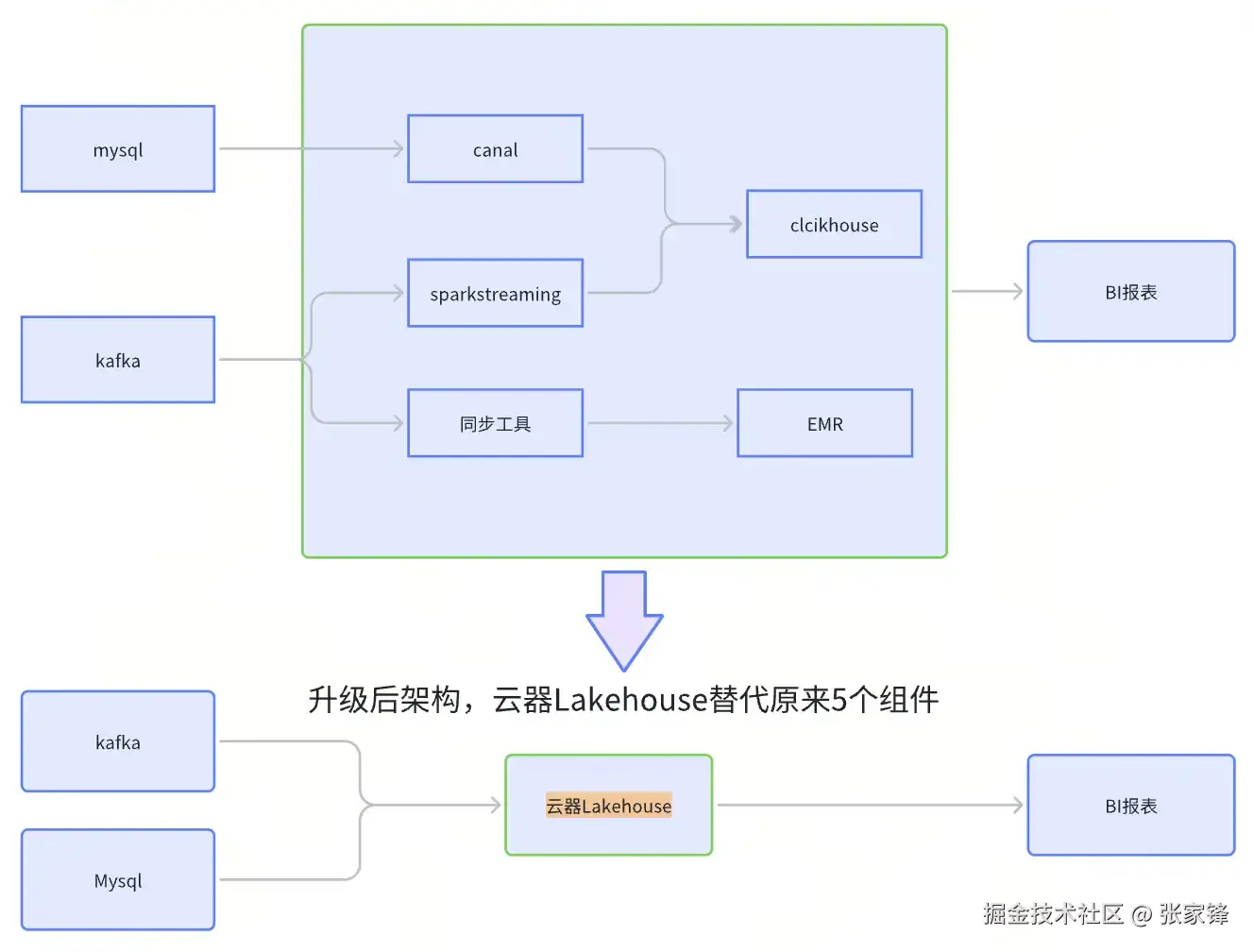 3、数据平台架构得到简化,降低了平台复杂度。 升级后的一体化湖仓平台,代替原有Kafka+Sparkstreaming+Clickhouse、与Mysql+binlog+canal+Clickhouse的技术方案,一套引擎满足多个复杂场景,缩短链路,减少了运维成本。如下图示: