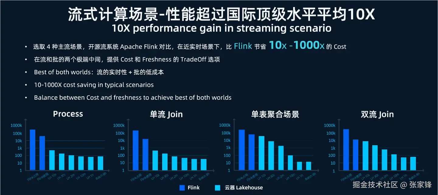 根据云器最近的测试,增量计算在近实时(小时级)的资源节省相对于流计算引擎有10倍的提升。(详见下表)