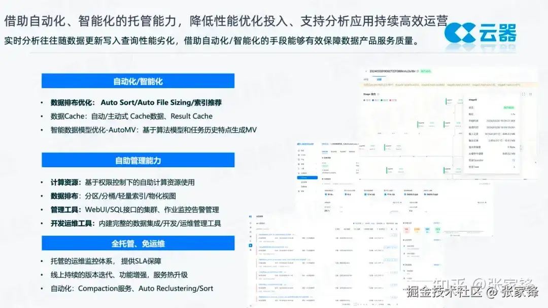 借助自动化、智能化的平台托管能力,持续优化分析性能。丰富的配套工具和产品化的管理能力,能够为业务、开发和分析人员助力,同时我们也希望能够提供更多智能化的方式,持续地去做产品的优化。