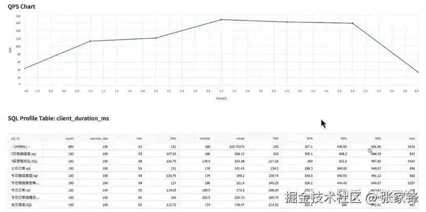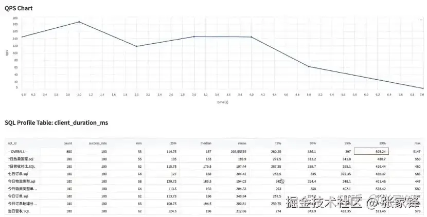 以我们的压力测试工具来验证,每个作业跑 100 遍, 以 32 个并发连接,不停地去发。可以看到并发情况,32并发,整个 QPS 在 120 秒,每个 query 在百毫秒就已经结束了。这就是客户端查询的情况。