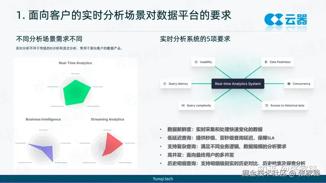 实时分析:要求数据要及时,查询很快能拿到结果,同时能够支撑比较大的并发,很可能有成百上千人在同时使用这个数据产品。另外,查询有简单的查询,也会有较为复杂的查询,要求数据范围更广。