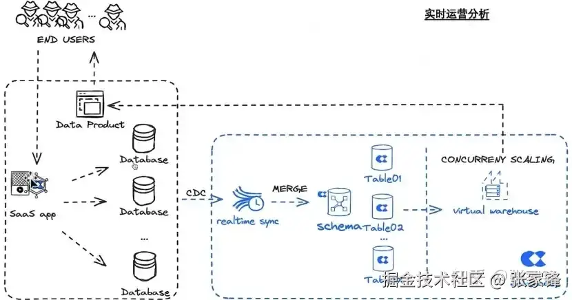 以SaaS 企业的实时运营分析为例, SaaS 企业里有很多的多租户数据在数据库中产生,有大量的分库分表。这类场景,往往需要将这些交易订单数据快速地分库分表地合并到数据仓库中,并立即开放给租户进行数据分析,几乎没有任何的数据加工。