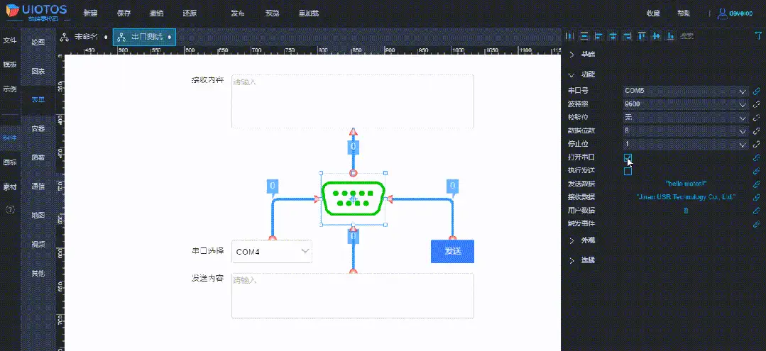 打开工具,拖放串口组件,与UI组件连线,就能搭建带有交互界面、串口读写的简单上位机应用——网页串口工具。如下所示: