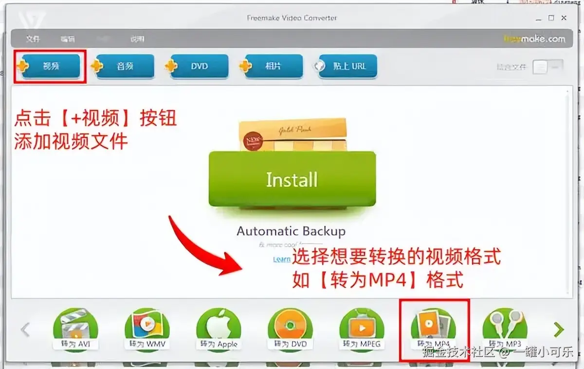 Freemake Video Converter为用户提供免费的视频转换功能,且界面操作简单,易于初学者上手学习,但其支持转换格式较少。下面介绍如何使用该工具转换视频格式,以视频转换MP4格式为例。