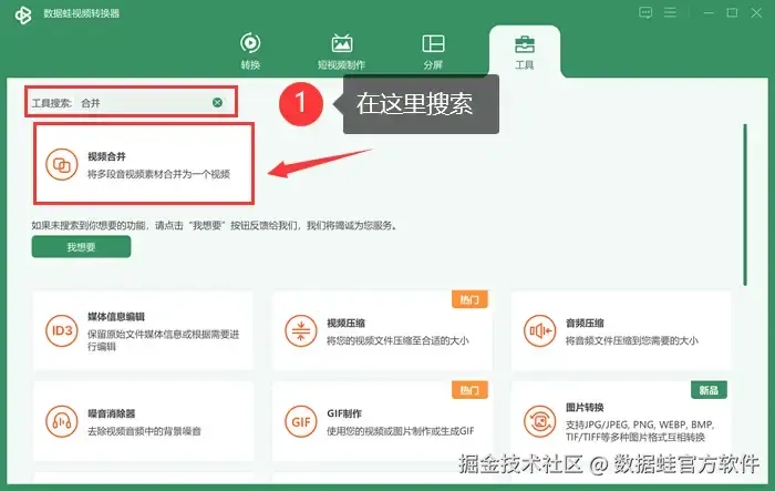 第一步: 打开数据 蛙后,点进 【工具】 ,在搜索栏搜索 【视频合并】 功能。