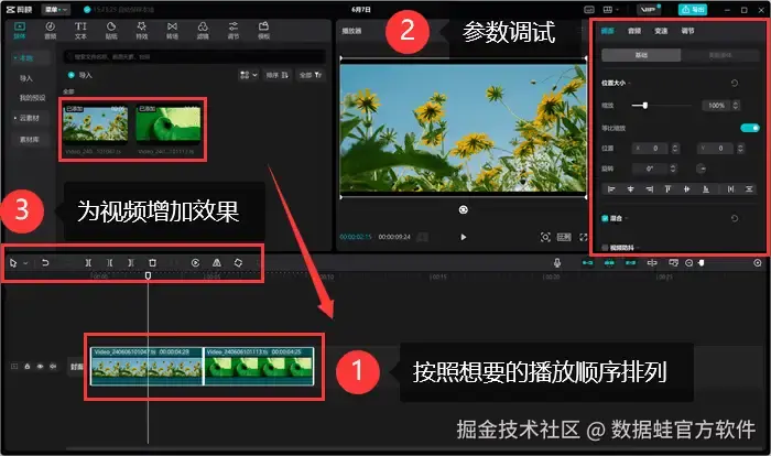 第二步: 如果需要,可以点击每个视频片段,在编辑菜单中调整视频的参数,如裁剪、缩放、旋转等。