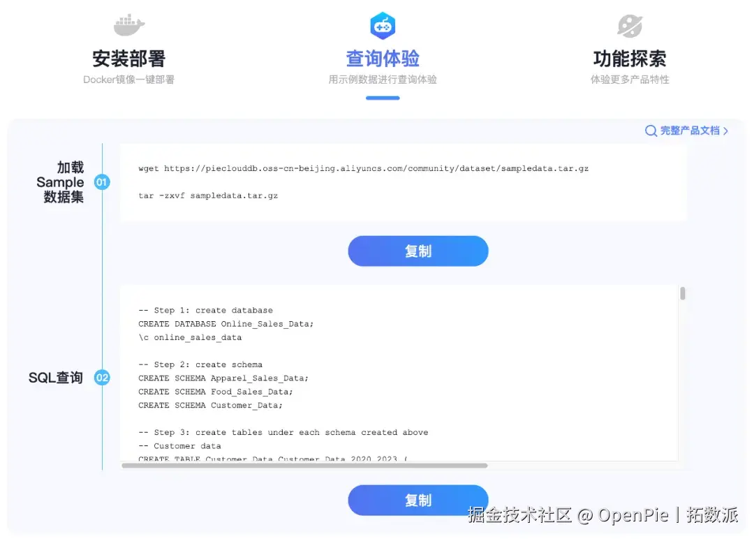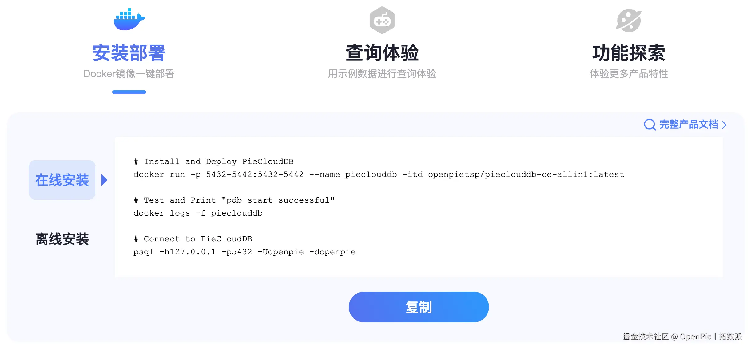 PieCloudDB 社区版提供免费下载,可通过 Docker 镜像一键部署。在网页的安装部署模块,我们准备了简洁的安装部署命令,一键复制,无论是在线安装还是离线安装,均可轻松完成部署!