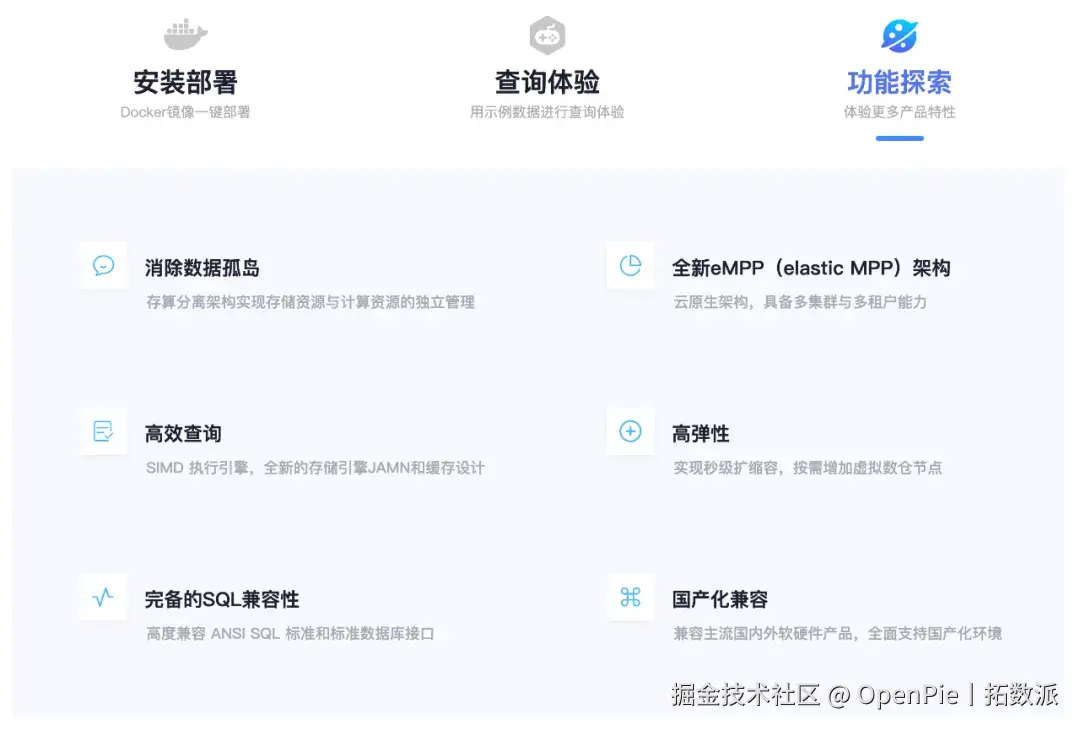 全新改版后的「PieStore」页面提供了六大内容模块,方便大家轻松便捷地上手 PieCloudDB 社区版。