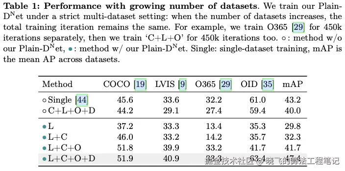 Plain-Det,提供了灵活性以适应新的数据集,具有跨多样数据集的稳健性能、训练效率和与各种检测架构的兼容性。结合Def-DETR和Plain-Det,在COCO上达到51.9的mAP,匹配当前最先进的检测器。在13个下游数据集上进行了广泛的实验,Plain-Det展现了强大的泛化能力。来源:晓飞的算法工程笔记 公众号,转载请注明出处