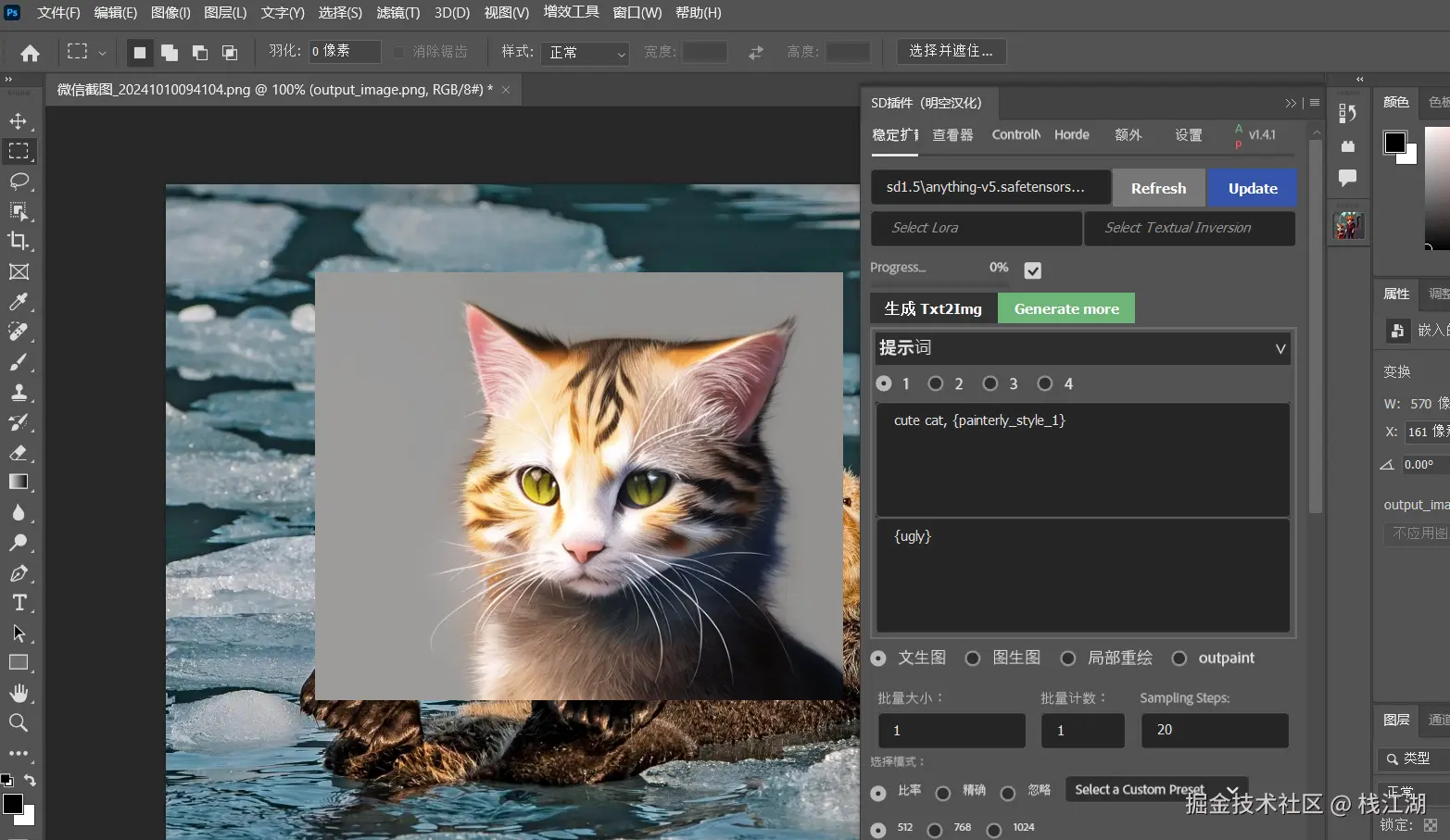 因为我们下载的SD整合包里默认自带了Automatic扩展。接下来就可以在photoshop中使用SD了,文生图、图生图、自动扩图等功能就可以直接在photoshop里使用了。
