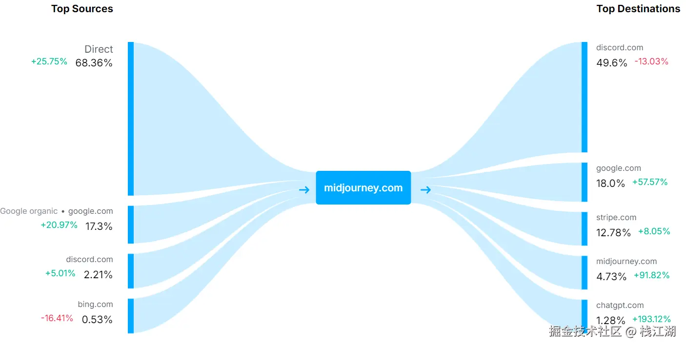 再来看看一张图,可以看到用户访问midjourney.com网站并不是通过google或bing搜索进入的而是通过直接访问midjourney.com进入的,当然早期用户主要是通过google搜索进入的。这里通过直接访问占比近70%,AI绘画主要关注的用户还是针对性的用户。最早期AI绘画刚刚出来后并不像AI聊天类产品是无差别的使用。