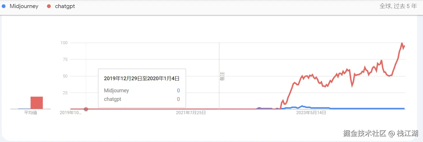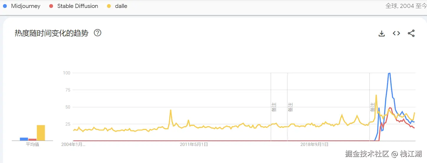 其实当下最热门的技术或者话题非AI莫属,AI的两个重要分支一个就是以chatgpt、copilot为代表的自然语言类聊天问答类AI;另一个分支就是以Midjourney、Stable Diffusion及Dall-E为代表的AI绘画类产品。可以看到自然语言类关注度与AI绘画的关注度的差别