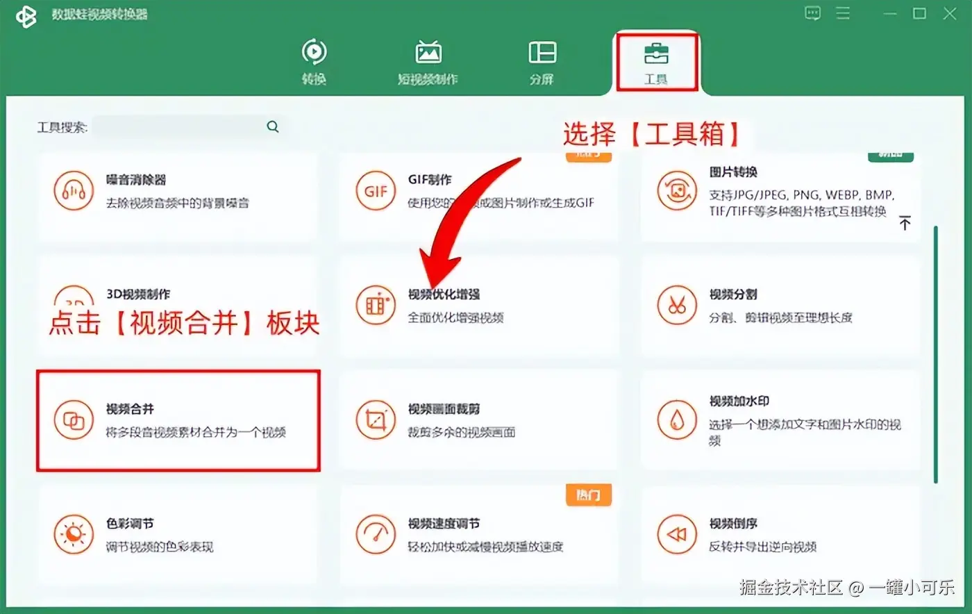 第一步:运行该工具,选择 【工具箱】 ,点击 【视频合并】 板块,进入视频添加界面。