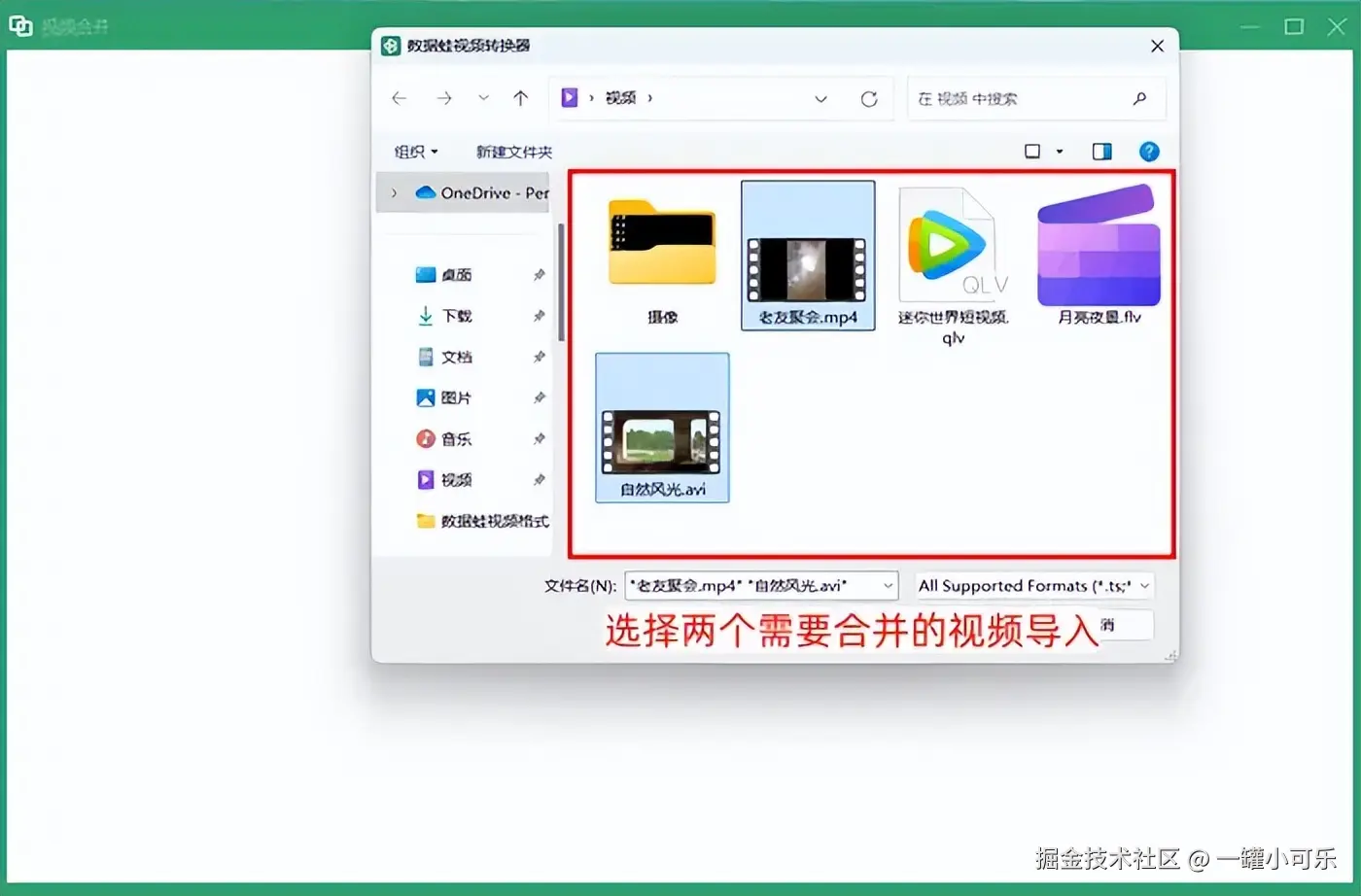 第二步:点击 【+】 ,打开本地视频文件夹,选择两个需要合并的视频导入该应用中。