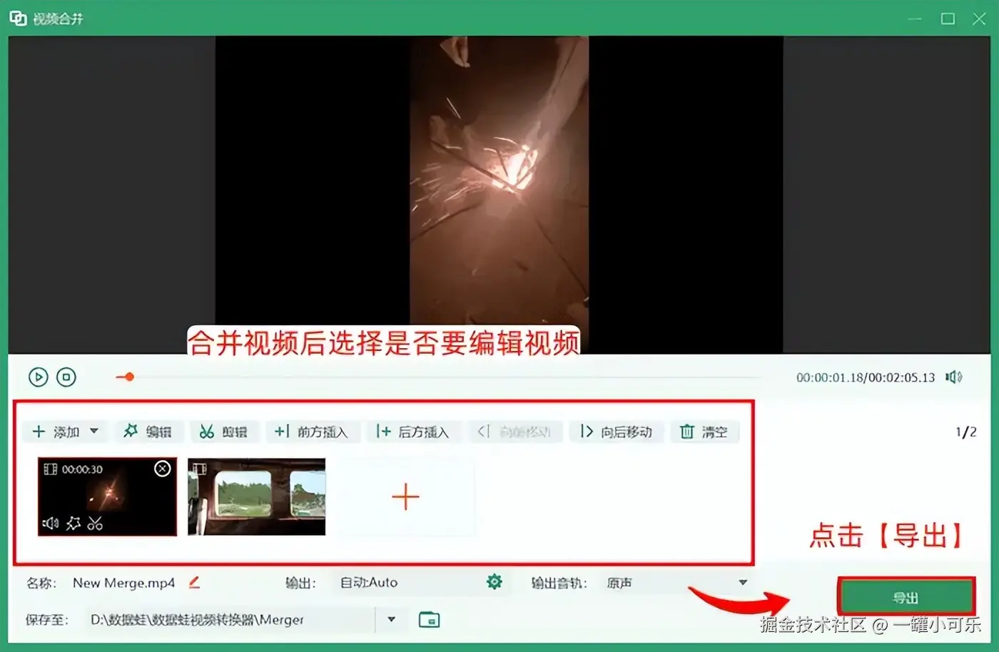 第三步:在视频合并界面,用户可以根据其提供的功能选项对视频进行编辑,完成编辑后点击 【导出】 即可。