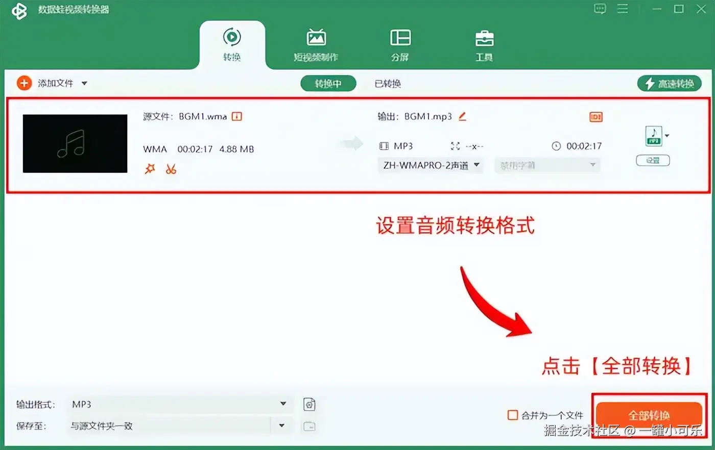 第二步:选择转换格式为【MP3】格式,并点击转换按钮即可。