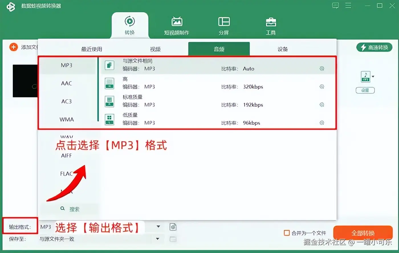 第二步:点击 【输出格式】 ,打开音频格式选择列表,在该列表中点击选择 【MP3】 格式。