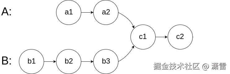 即,双指针,A 指针当遍历完 A 链表,再遍历 B 链表;B 指针遍历 B 链表后再遍历 A 链表后,