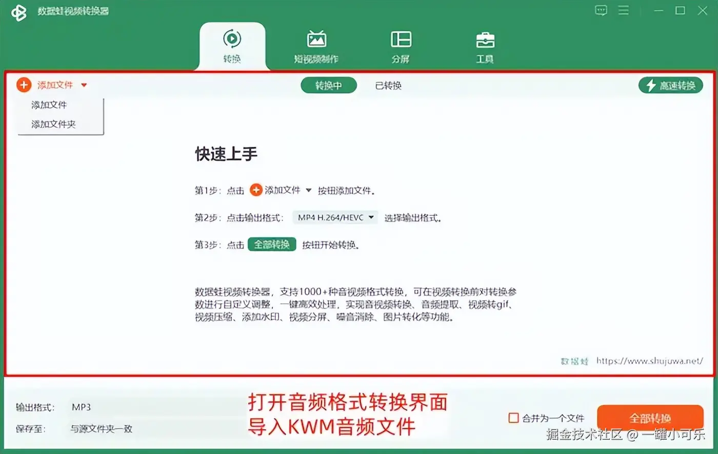 数据 蛙视频转换器在转换音频方面具有高转换质量、批量转换以及多格式导入等功能。因此,使用这个工具将KWM转MP3可以输出较高的音频文件,满足用户对于音频的高音质要求。