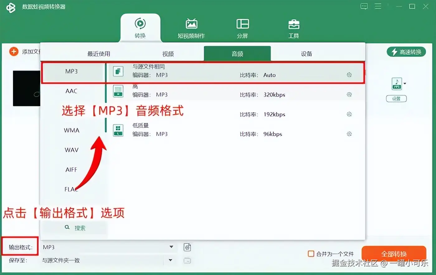 步骤2:选择格式转换界面下的 【输出格式】 选项,选择 【MP3】 格式。