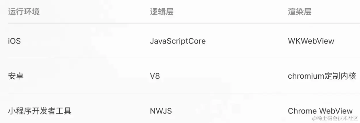 所以基于这些情况,微信内部阻止了一些操作dom,跳转,动态脚本执行的接口,只提供了一些js的脚本执行器,所以小程序提供了一个沙箱环境,这个环境不能有浏览器相关操作,而对于客户端来说,本身微信app就有内置的js解释引擎,iOS下是内置的JavaScriptCore框架,在安卓则是用腾讯x5内核提供的JsCore环境,创建了独立的线程去执行js代码,这个线程中执行的都是相关的业务逻辑的代码,逻辑相关的内容都在这里处理,渲染相关的都在webview中处理,通过逻辑层去控制渲染层的展示,这就是小程序的双线程模型