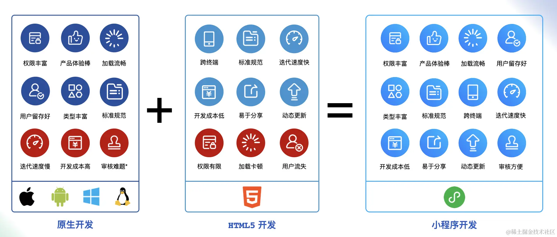 首先如果采用webview的渲染我们也提到了,同一个线程阻塞导致性能问题,采用native的方式做渲染的话我们改动小程序代码还需要同微信客户端一起发包,显然是不可能的,既然两个都不行,那采用hybrid的方式呢?将两者结合,比如react native就采用了这种方式