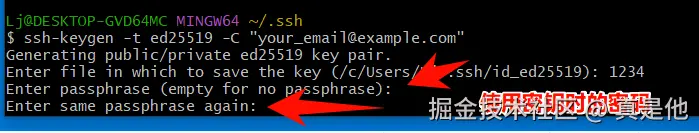 再根据提示输入两次密码(在用密钥管理仓库时使用,也可以为空)。
