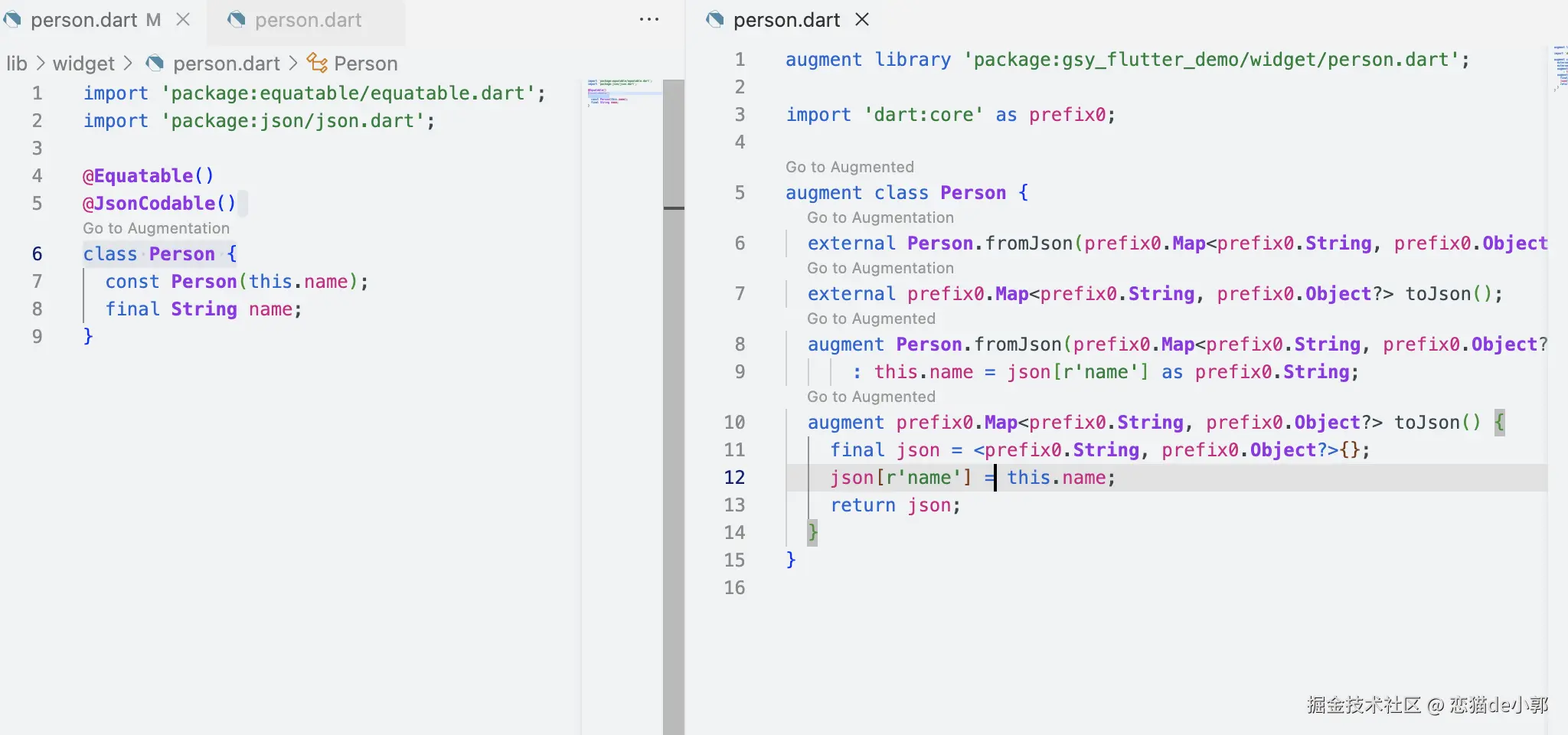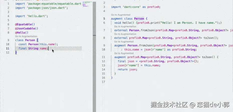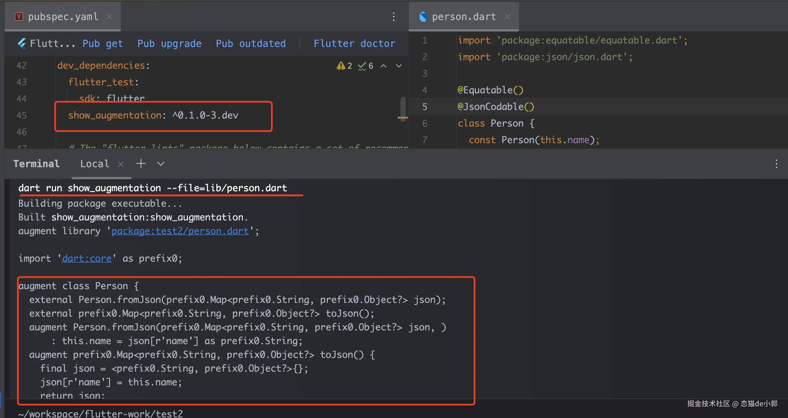 当然,如果你是 Android Studio ,可能会看不到这样的支持,那么你可以通过引入一个 show_augmentation 的包来做到类似的功能预览,如下所示,通过运行 dart run show_augmentation --file=lib/person.dart 后,也可在命令行得到类似的输出:
