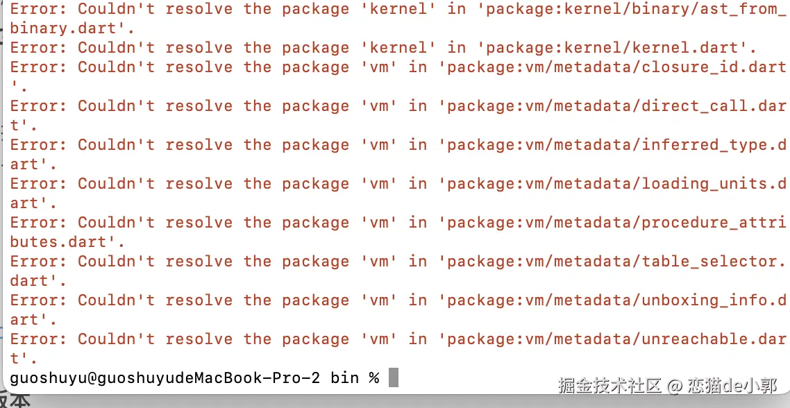 当然,上面命令的pkg/vm/bin/dump_kernel.dart 需要在官方 dart-lang/sdk 的全量 SDK 才能找到,但是如果你直接 clone dart-lang/sdk 项目,然后去执行 dump_kernel ,基本上会遇到下面这个问题: