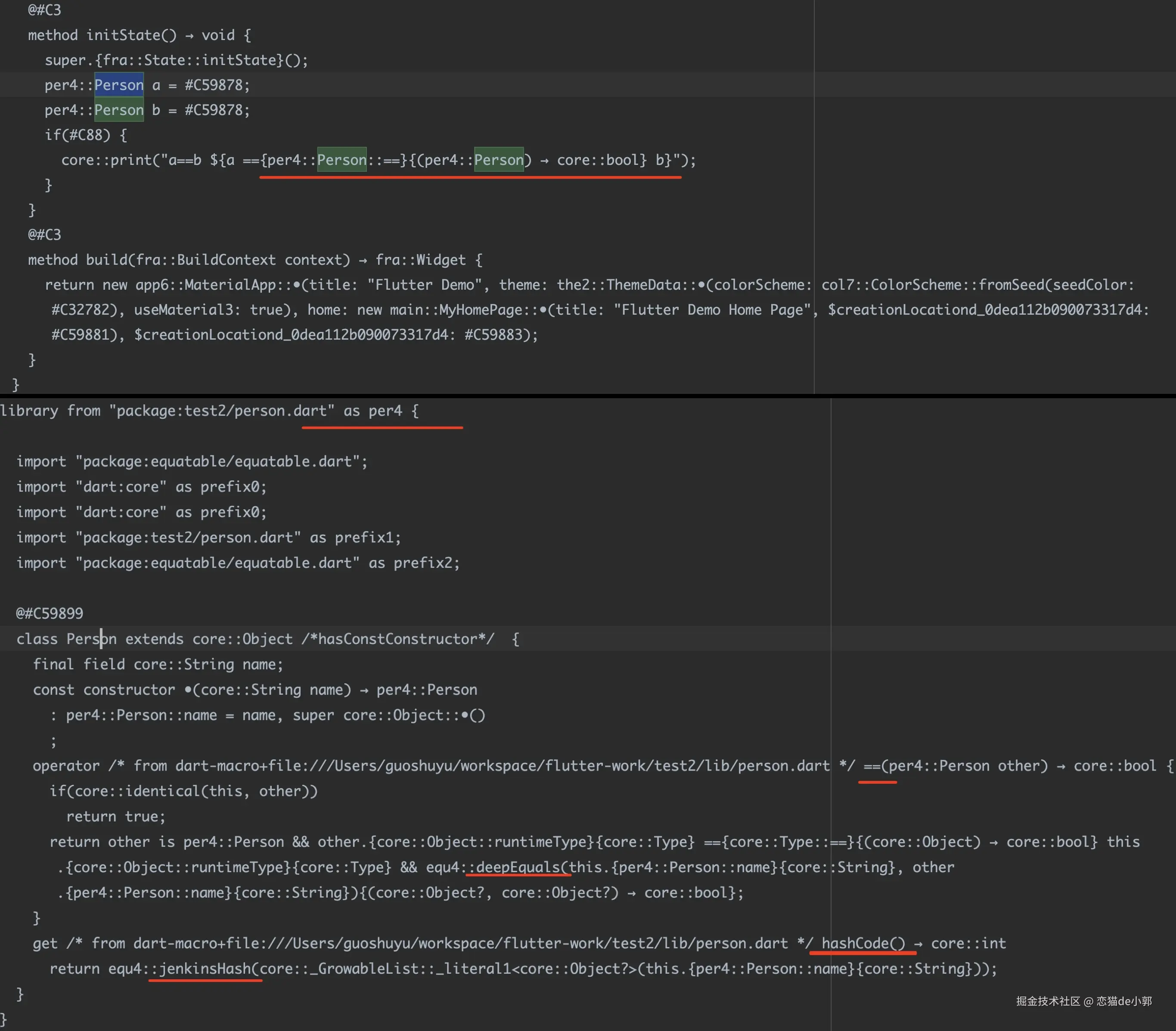 如下图所示,可以看到 "dart: core" 都加上了前缀,然后对应的方法都已经动态添加进入,并且标明了 marco 和 file 路径,同时如 deepEquals 和 jenkinsHash 也成功引入。