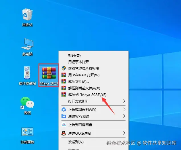 1.通过文章末尾处下载软件,鼠标右键【Maya 2023】压缩包,选择解压到Maya 2023。