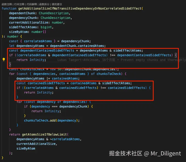 如果小块在使用这个方法时没有合并,可以检查一下小块内是不是存在不合理的副作用,可以看下这些副作用是否可以去掉。如果确定小块内没有副作用,可以确认下执行代码压缩之前chunk的大小是否被experimentalMinChunkSize覆盖,因为在renderChunk的时候,压缩逻辑没有被执行,所以在使用时,可以尽量设置大一点。